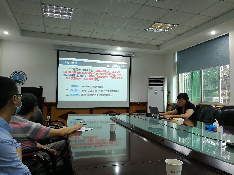 公司在2019年上半年已经开始着手人工智能专业申报的准备工作,调研了已有该专业的其他高校的人工智能专业的培养计划、课程体系和实施方案,论证了电信学院以现有的基础时可以完成人工智能专业人才培养的要求的。在学院的的统筹安排下,成立了以孙祥娥教授为首人工智能专业申报小组,先期完成了人工智能专业设置申报书和专业建设规划。本次会议首先听取了孙经理关于专业申报的前期工作汇总报告,接着讨论了专业申报答辩的材料准备工作,明确了学院在该专业申报上的义不容辞,且学院的团队建设、办学经验、人才质量等方面的优势明显。最后就汇报PPT的组织上,大家群策群力,具体到图表数据的组织和展示方式。